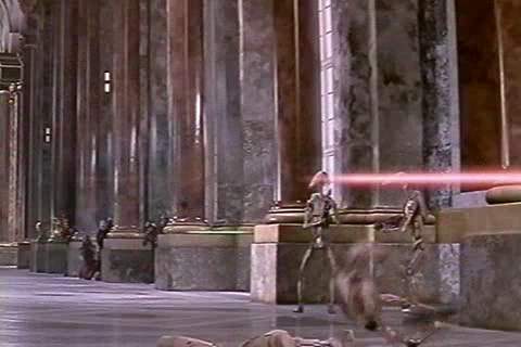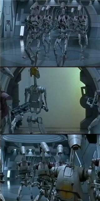 После уничтожения посольского звездолета, дроиды подходят к каюте с джедаями, при этом стоят довольно компактной группой, что делает их групповой мишенью: при наличии у противника оружия, стреляющего очередями, всю группу можно было расстрелять за полсекунды. Даже, если у противника лазерные мечи, такое построение не слишком эффективно. Когда же открыли дверь, дроиды стали таким образом, что впереди стоящие перекрывают сектора стрельбы стоящим сзади, образуя «мертвые зоны», которые может использовать противник, уменьшая таким образом, огневую мощь группы.
