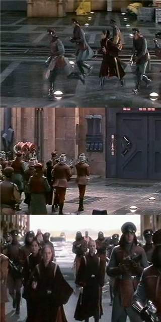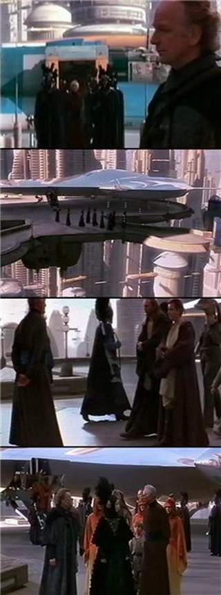 На Корусанте охрана канцлера поставлена из рук вон плохо – никто не запретил полеты вокруг посадочной площадки, т.е. спокойно можно было направить флаер с взрывчаткой на посадочную площадку и убить канцлера, отсутствуют телохранители. Гвардейцы же не подходят на эту роль, т.к. вооружены длинноствольными винтовками, мало пригодными для боя на короткой дистанции, да и оставили канцлера наедине с лже-королевой и сенатором, чего бы настоящие телохранители не допустили.