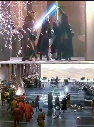 Во время уличного боя, гвардейцы расположились так, что почти все не имеют защитных укрытий, принцесса почему-то бежит впереди всех, при входе в ангар, Амидала снова впереди, хотя ей надо было расположиться в средине наступающих.