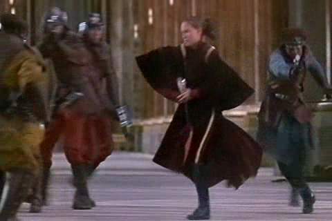 Когда же ТФцы переключили внимание на лже-принцессу, Падме достала из тайника оружие и на пару с капитаном перебили охрану. Тайник был изготовлен довольно примитивно, и странно, что его не обнаружили. Правда, Падме могла и не разделять действий: она сначала крикнула капитану, и лишь потом открыть огонь, а могла это сделать это одновременно.