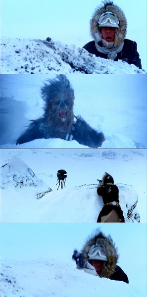 Первый бой, если можно так сказать, произошел на Хоте, когда Люк очнулся в пещере вампы. Он почему-то пытался дотянуться до своего светового меча, хотя на бедре у него была кобура с бластерным пистолетом. Второе боестолкновение состоялась, когда разведдройд Империи встретился с парочкой экс-контрабандистов. Наблюдал за дроидом Соло и Чуи высунувшиль над сугробами, плюс еще были не в маск-халате – его парка и мех вуки были хорошо видны на белом фоне. При стрельбе Соло дважды выстрелил с одного и того же места (второй раз можно было выстрелить, высунувшись справа от сугроба), что опять таки, было ошибкой. Когда дроид развернулся в сторону Соло, стрелять следовало Чуи. Плюс еще позиция Чуи была такой, что он находился на линии огня Хана.