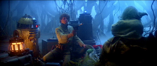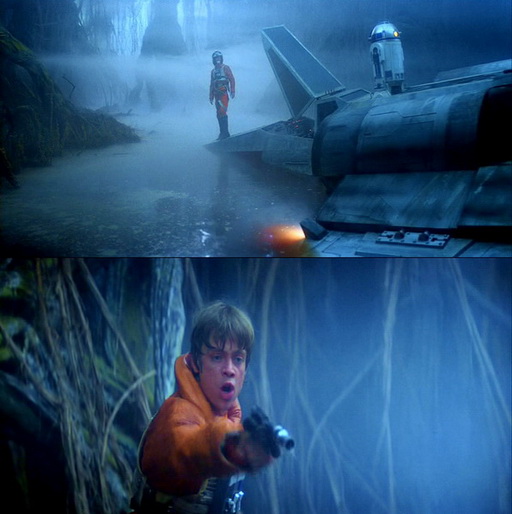 Перенесемся на Дагоба. Люк выбирается из истребителя и, не осмотревшись, не достав бластер, идет исследовать окрестности. Вытащил его лишь когда Р2 попал в пасть местному аллигатору.