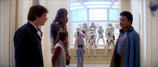 Комитет по встрече Соло представлен шестью охранниками, Ландо и Лоботом. Охранники, как и в случае с Вейдером, стоят позади охраняемого лица, хотя тут подошло бы построение тройкой (один охранник спереди, два чуть сзади по бокам) или ромбом. Калриссиан не прикрыт от атаки со стороны Соло и компании. Лишь один охранник держит ладонь на рукоятке пистолета, в то время как остальные стоят чуть ли не расслабившись. Правда, стрелок занял невыгодную позицию: ему закрывает обзор Хэна киборг с Ландо.