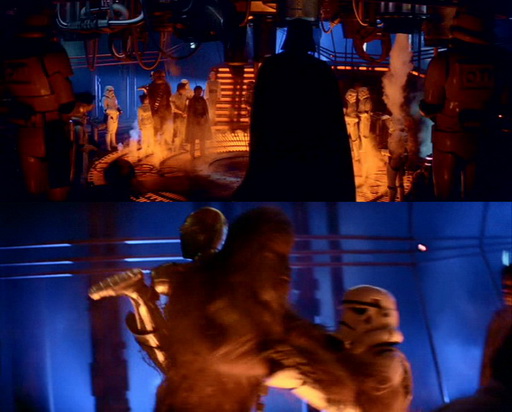 Появление штурмовиков возле Леи, Соло и «порядочного человека» было полно промахов: 1. Они встали так, что первый ряд перекрывает линию стрельбы второму, т.е. в случае попыток бегства или стрельбы со стороны Леи, Чуи и Хэна, огонь открыть мог лишь первый ряд и один из штурмовиков второго ряда, но в крайне узком секторе стрельбы. 2. На линии стрельбы оказались не только Лобот и Ландо (и ситх с ними), но и Вейдер. 3. Сами они находились на линии огня Бобы, и могли быть зацеплены «дружественным» огнем.