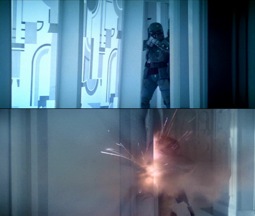 Люк, идя по коридору города, держит ствол бластера направленным вниз. При подходе к углу коридора, поворачивает сразу, а не обходит по дуге. Потмом вообще спрятал бластер и достал его при появлении Фетта.