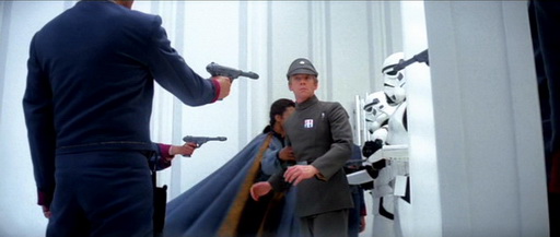 Бежа по коридору, Люк не осмотрел боковой коридор, где мог быть враг. Офицер, вовремя заметил Люка, вернее, его тень, успел отдать приказ своим солдатам открыть огонь, а затем схватил Лею и потащил ее к выходу, прикрываясь ею как щитом.