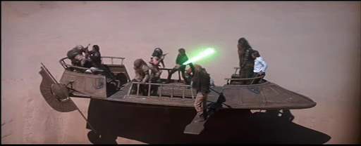 Остальные же наемники развлекались стрельбой по скиффу с Соло и компанией, а не пытались пристрелить ползающего по обшивке Люка, хотя тот был довольно уязвим в этот момент.