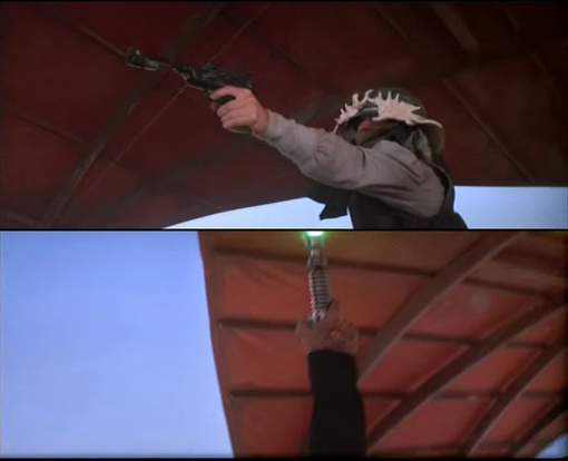 ВиКвай, решивший пристрелить Люка, когда тот прыгнул на баржу, сделал ошибку: вместо того, чтобы прижаться к переборке справа от проема люка и стрелять из яхты, высунулся в проем и тоже отправился к Сарлакку.