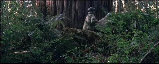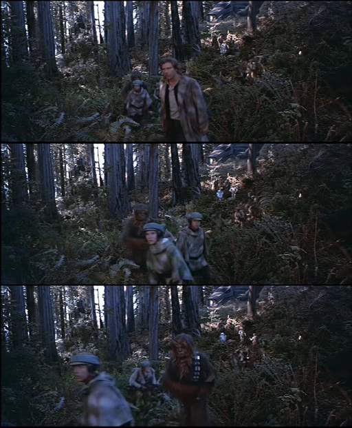 Непонятно зачем перед бункером на поляне столпилось так много народу. Конвоировать пленников хватило бы человек 15. Когда началась атака эвоков, AT-ST вместо того, чтобы остаться на поляне и прикрыть вход, полезли в лес, где аборигены их заманили в ловушки.
