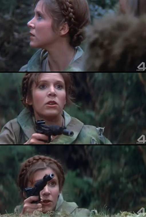 Вернемся к Лее Органе. Очнувшись и познакомившись с местными аборигеном, она решила перекусить. Когда эвок внезапно напрягся и начал водить копьем, принцесса вместо того, чтобы спрятаться за бревном и вытащить пистолет, или, на худой конец, достать лишь оружие, стала вертеть головой. Когда в нее начали стрелять из бластера, принцесса все же укрылась за бревном, но вместо того, чтобы сразу же сменить позицию (т.к. было ясно, что ее местоположение известно противнику), достала пистолет и снова высунулась осмотреться над бревном в том же месте!