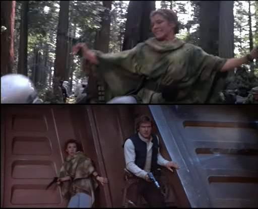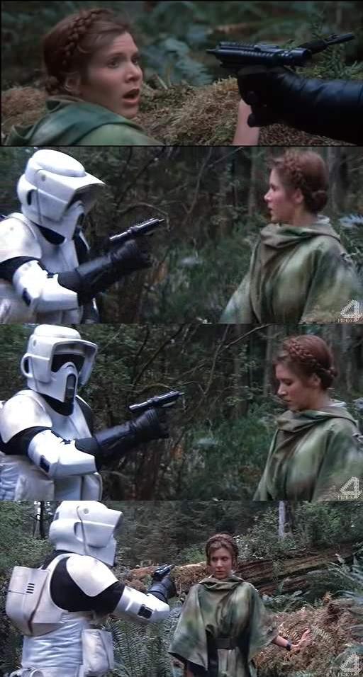 Лея, едва началась суматоха, вернула себе бластер, при этом ближайшего штурмовика зачем-то пнула ногой, а не застрелила, после чего убила водителя AT-ST и укрылась у входа в бункер вместе с Хэном, правда так, что подстрелить ее было довольно легко.