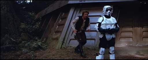 Лея же затеяла игру в догонялки со вторым скаут-штурмовиком. Когда спидер-байки поравнялись друг с другом, разведчик пустил в ход свой пистолет и подбил машину Леи, пока та размышляла, что делать. Но при этом имперец засмотрелся на взрыв и врезался в дерево.
