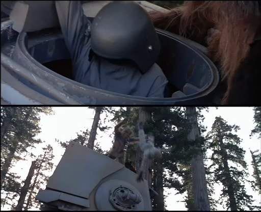 Пилот одного из AT-ST совершил глупость, когда на их крышу забрались эвоки с Чуи. Вместо того чтобы попросить у штурмовиков помощи в очистке обшивки машины от «зайцев», пилот вылез сам на крышу без оружия.