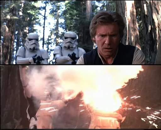 Хэн Соло опять же не смог без позерства снять часового, выстрелив в спину – кореллианин хлопнул штурмовика по плечу и побежал за бункер.