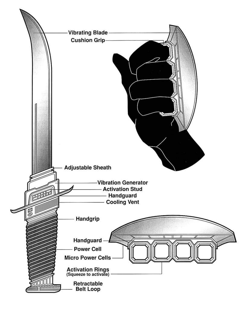 Выше я упомянул уличные потасовки. Так вот, еще одним излюбленным оружием уличных банд, наемных убийц и прочей подобной публики были виброкастеты. Они могли быть выполнены в виде кастета с широким лунообразным клинком (один из таких на иллюстрации) или выглядеть как обычный кастет с небольшими шипами. Миниатюрный вибрационный механизм активировался сжатием кулака или нажатием небольшой кнопки. Энергоячейка в виброкастетах работала недолго, но и уличные драки редко бывали продолжительными. Такие кастеты иногда использовали наемные убийцы, охотники за головами и контрабандисты, на правах оружия скрытого ношения или как оружие последнего шанса, когда в ружье закончились заряды, пистолет сломали супостаты, а гранаты закатились невесть куда.