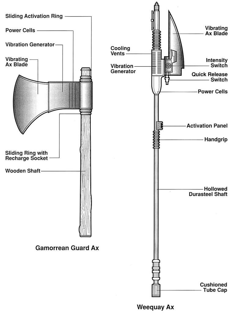 Вторым оружием из фильма были виброглефы, которыми были вооружены охранники викваи (см. иллюстрации в приложении). Называлось это чудо техники BD-1 Cutter vibro-ax. И я не утрирую. По сравнению с примитивными убивалками их хрюкающих коллег по профессии, эти глефы были действительно качественным оружием. Они изготавливались из легкой, но прочной дюрастали, были оснащены специальным демпфером для снижения остаточной вибрации и имели удобно размещенную панель управления. Мощный УВГ позволял создавать высокочастотные вибрации до нескольких тысяч колебаний в секунду. Это, в сочетании с приличной массой ударной части глефы и хорошей сбалансированностью, позволяло гарантированно рубить все на свете, в том числе дюрасталевые или пластоидные доспехи, которые в иных ситуациях могли выдержать прямое попадание бластерного выстрела.