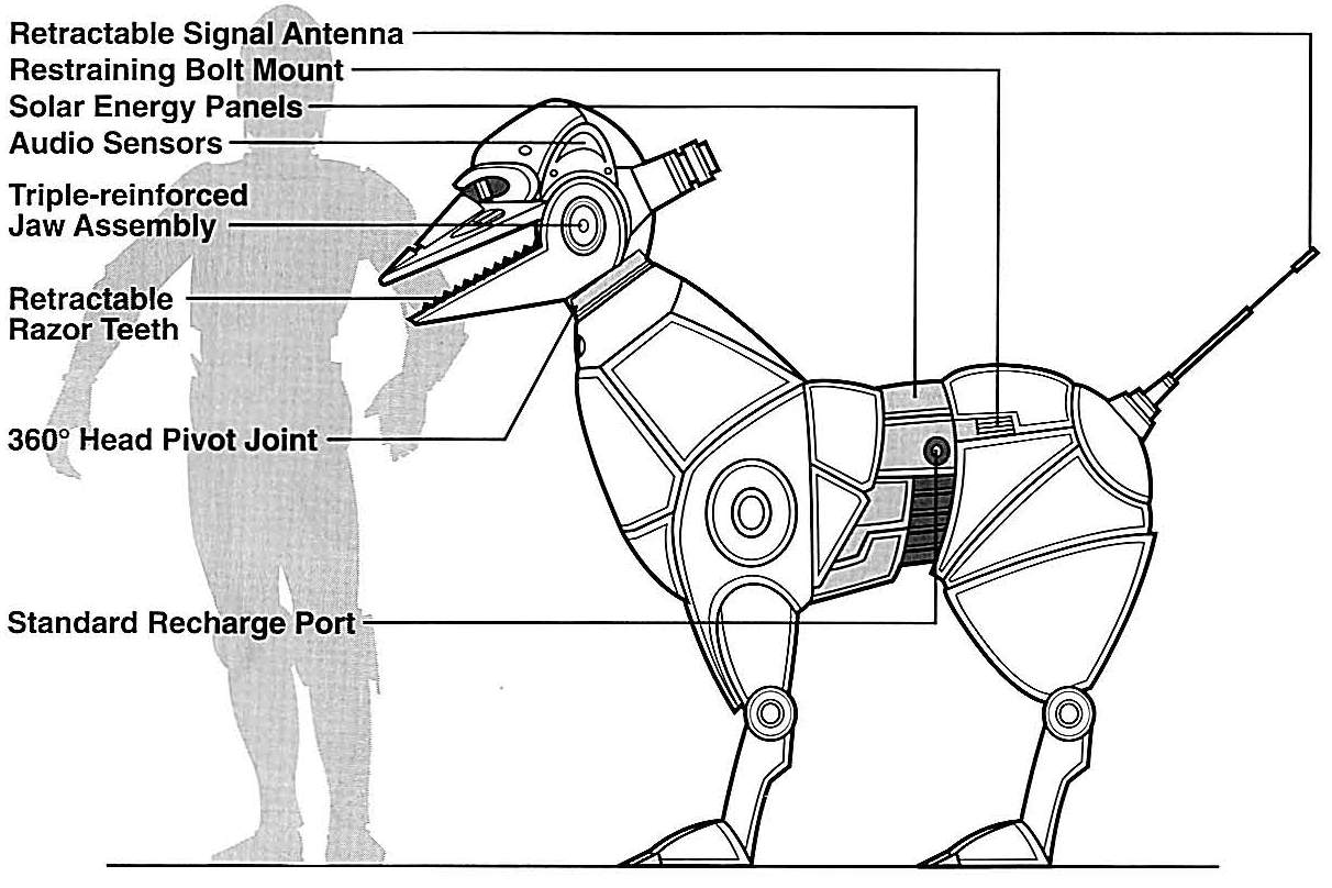 В случае обнаружения угрозы для хозяина или самого дроида, реакция машины была мгновенной. Зубы с лязгом появлялись из челюстей, а пасть раскрывалась, демонстрируя недоброжелателю частокол острых металлических зубов. Одновременно с этим грудная панель разъезжалась в стороны, и оттуда появлялось дуло бластера. Как вы понимаете, милый механический песик, в одно мгновение превращавшийся в рычащего вооруженного дроида не лучшим образом действовал на моральное состояние бандитов.