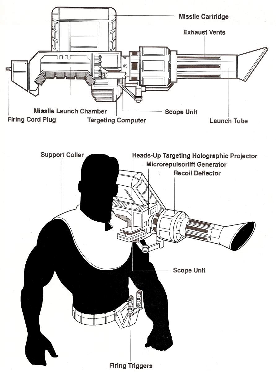 В результате проведенной модернизации гранатомет основательно потяжелел, что потребовало использования «невидимых сошек» — небольшого встроенного репульсорного проектора благородя которому стрелок практически не ощущал вес оружия. Остаточный вес «гасится» специальным горжетом и поясом, равномерно распределявшими вес оружия. Репульсор и горжет использовались не только для облегчения переноски гранатомета. С их помощью, а также за счет динамо-реактивного принципа, стрелок не ощущал отдачи при выстреле. Это позволяло, не теряя наведения на цель, запустить несколько ракет подряд без потери точности. Выпустив весь магазин, за несколько секунд стрелок мог скрыться за укрытием и там произвести замену магазина. К слову, опытный стрелок-оператор мог заменить магазин всего лишь за шесть секунд.