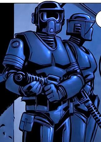 | Основное оружие | SoroSuub Blaster Carbine (оснащенный устройством снижения вспышки и звука при стрельбе), бластерный пистолет, вибронож. Часто использовались стандартные бластерные винтовки Е-11, тяжелые бластеры Т-21 или другое штатное оружие состоящее на вооружение штурмового корпуса. |