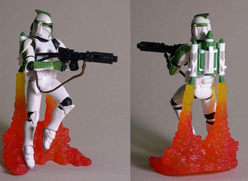Во время Войны Клонов использовались ракетные ранцы нескольких моделей. Чаще всего встречались JT-12 – одна из наиболее распространенных моделей на рынке военных и гражданских ракетных ранцев. Хотя в отличие от мандалорских учителей, клоны использовали ранцы без пусковой установки с мини-ракетой. Доспехи (бронекостюмы) ракетных десантников ничем не отличались от защитного снаряжения «пеших» клонов и в ходе войны прошли ту же эволюцию. От несуразной Фазы I до более совершенной Фазы II.