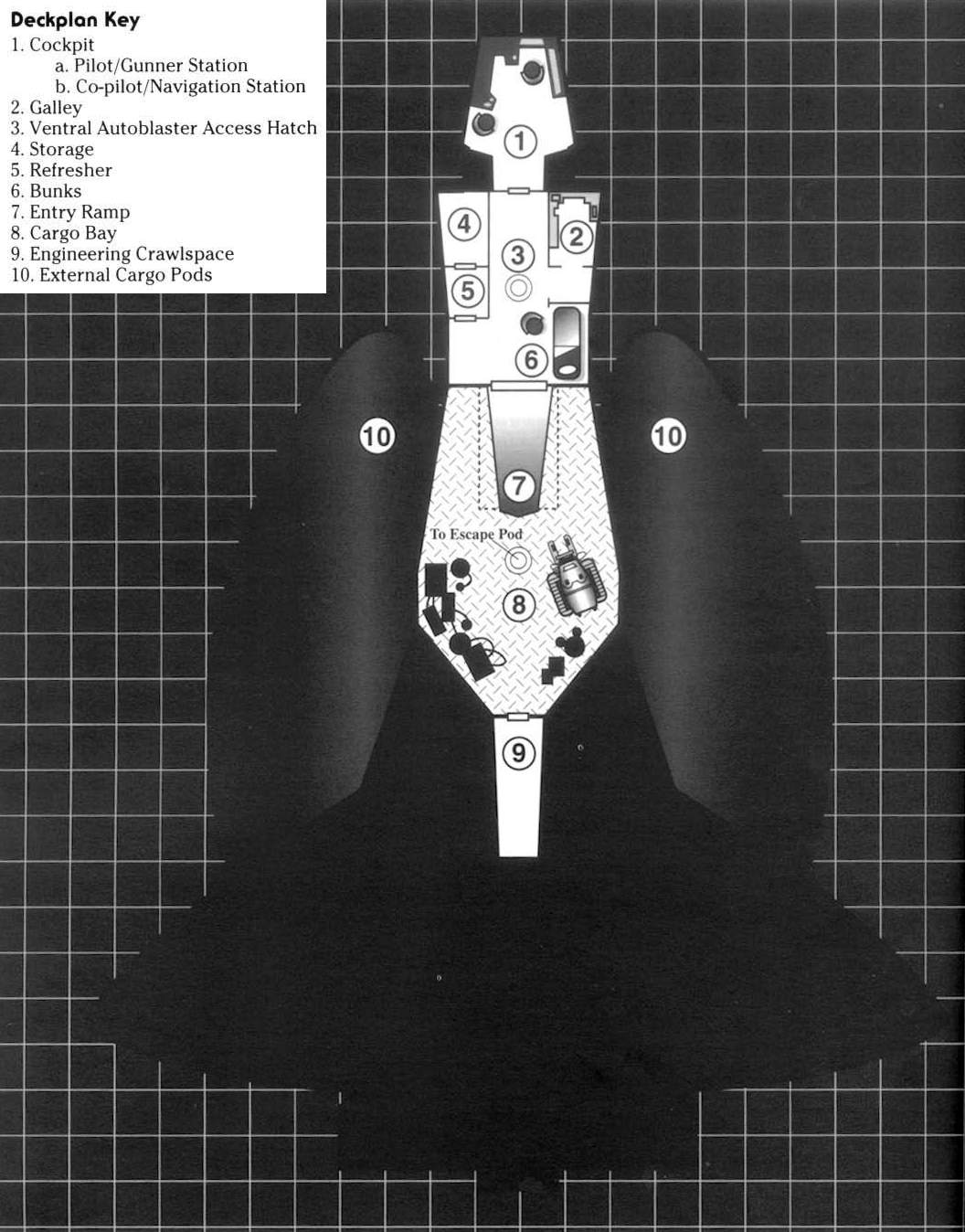 | Вооружение | 1 автобластер или легкая импульсная лазерная пушка BlasTech Ind. Prm-3. Размешена в носовой части судна. Эффективная дальность стрельбы: 20 единиц в космосе или 2 км. в атмосфере | |
