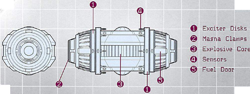 Описываемое оружие состоит из большой, округлой ёмкости, заполненной взрывной смесью из неустойчивого жидкого барадиума и летучего газа, называемого «коллапсиум». Ядро обрамлено двумя электромагнитными дисками-возбудителями. Когда мина выбрасывается в пространство, эти диски начинают посылать электрические импульсы в ядро, тем самым постепенно приводя к взрыву смеси. К моменту столкновения с неудачливой целью, ядро оказывается сверхзаряженным.