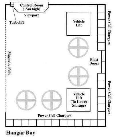 | Ангар | до нескольких десятков челноков, легких транспортников и истребителей с посадочными опорами | |
