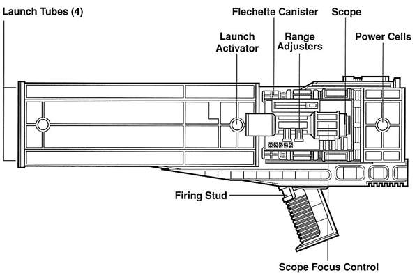 Оружие имеет четыре ствола, в каждом из которых находится по одному контейнера с иглами. В верхней части оружия установлены два дополнительных контейнера, автоматические заряжающиеся в опустевшие стволы верхнего ряда. Перед нажатием на спуск стрелок выбирает ствол, из которого будет произведен выстрел. Если этого не сделать, запуск контейнеров будет вестись последовательно. Выбор выстреливаемого контейнера осуществляется поворотом шпильки сбоку от пистолетной рукоятки без изменения положения стреляющей руки. Так как ружье не имеет отдачи, оно зачастую не оснащается прикладом.